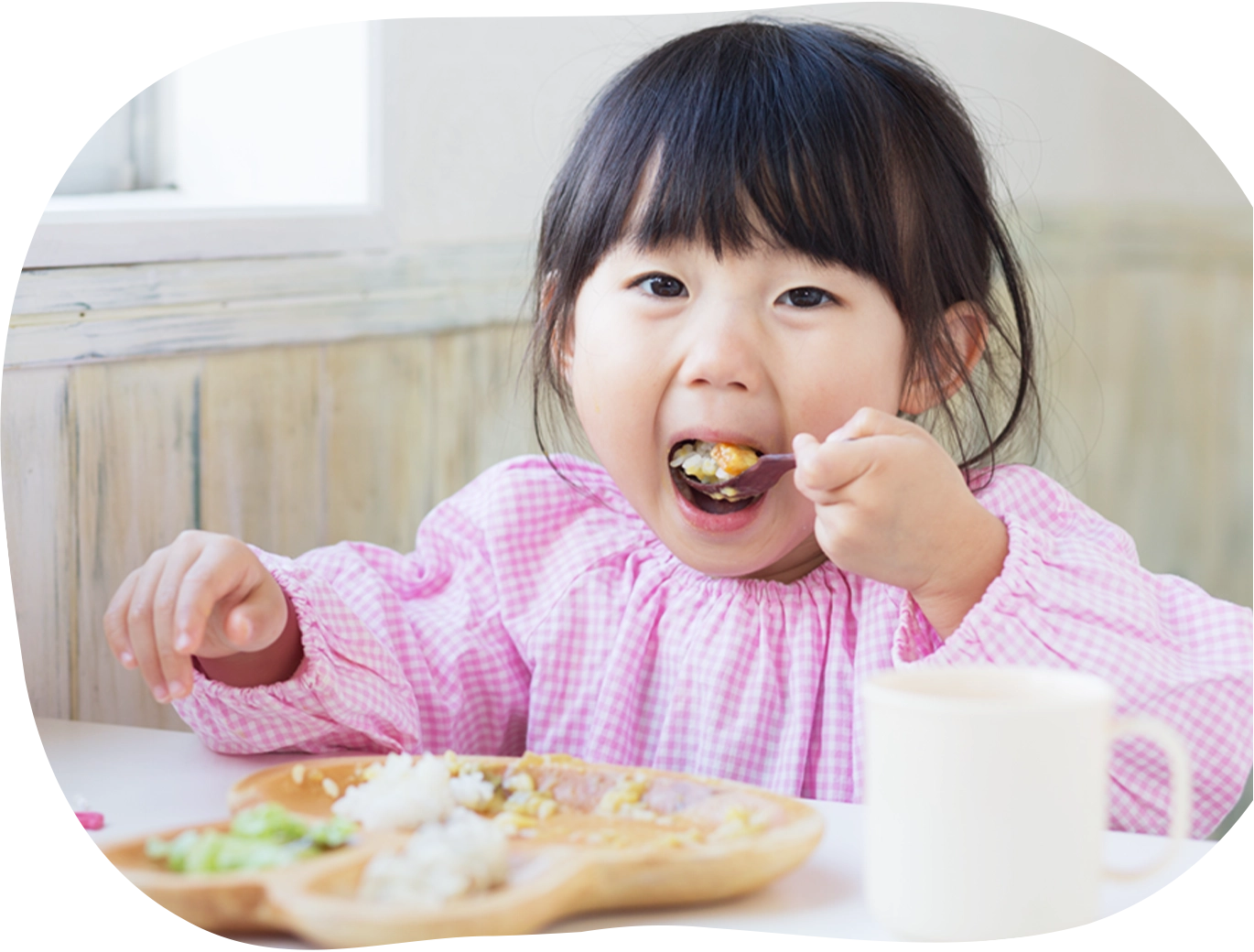 当園では、こどもたちが食べることの大切さや楽しさを学べるよう、旬の食材を取り入れた給食の提供や野菜の栽培体験、クッキング保育などを通して、五感を使った「食育」に力を入れています。